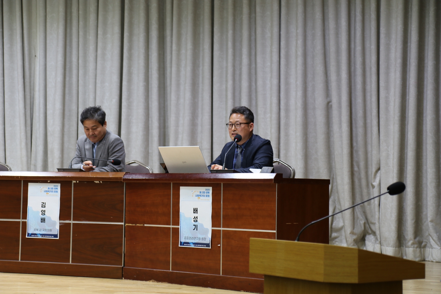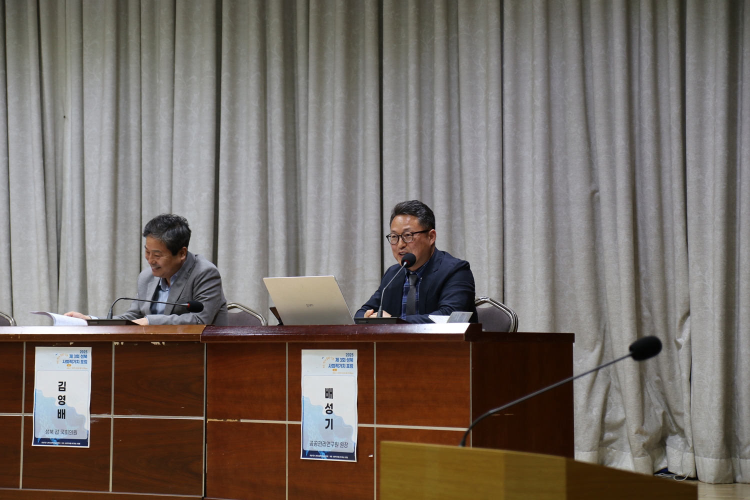 공공관리연구원 배성기 원장은 지난 9월 30일, 성북구청 아트홀에서 열린 제3회 성북 사회적가치 포럼의 거버넌스 부문에 참여해 「거버넌스 선진화를 위한 민간위탁 및 관련 제도 개선 방향」을 주제로 발제를 진행했다. 이번 포럼은 ‘모두 함께 돌보는 성북’을 슬로건으로 지역 아동 돌봄, 사회연대경제, 협력적 거버넌스 등 지역사회 의제를 함께 논의하는 자리였다. 특히, 배성기 원장이 참여한 100분 토론에서는 ‘성북, 거버넌스와 연대의 미래를 그리다.’라는 주제로 각 발제자의 거버넌스 분야 발표가 이어졌다.