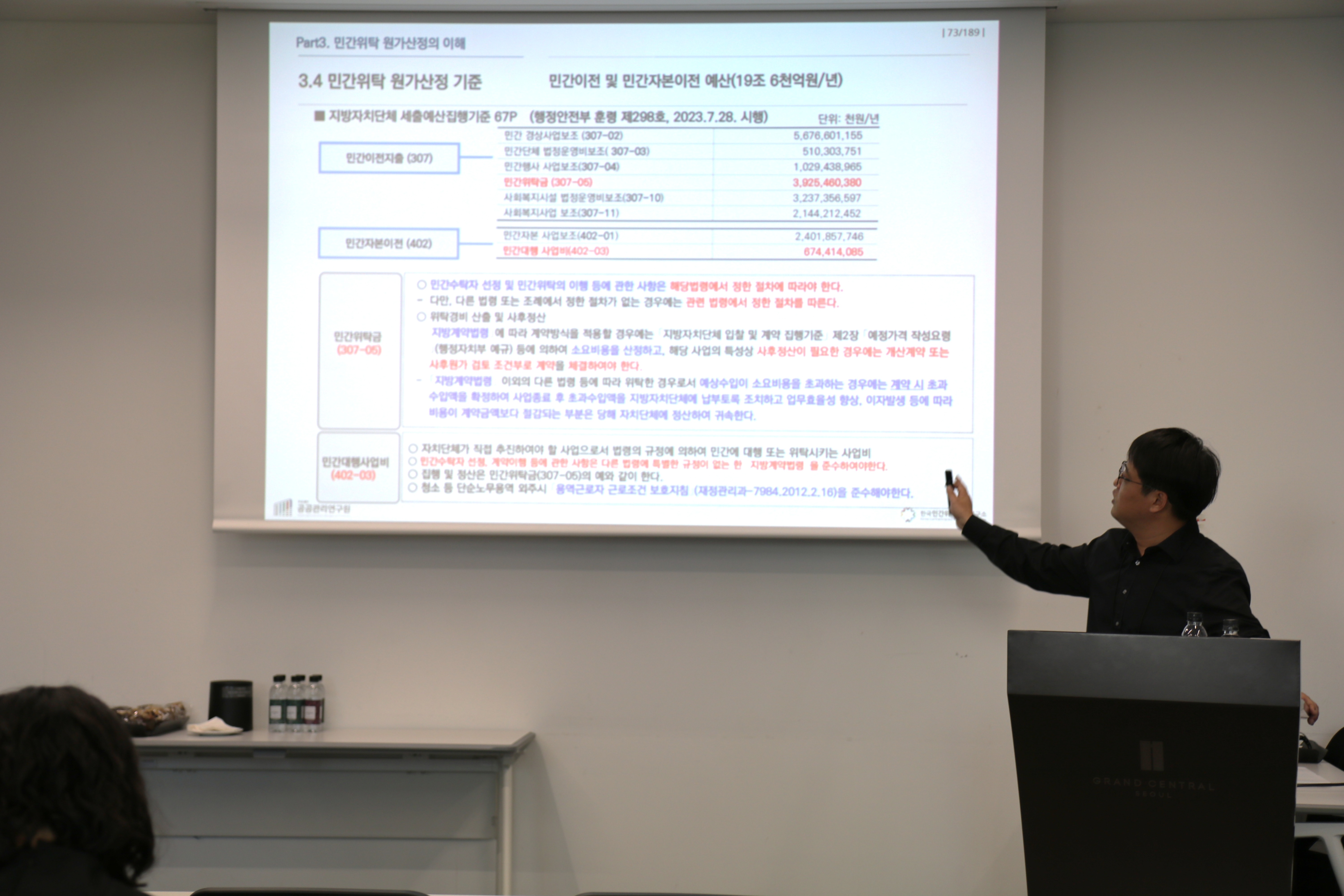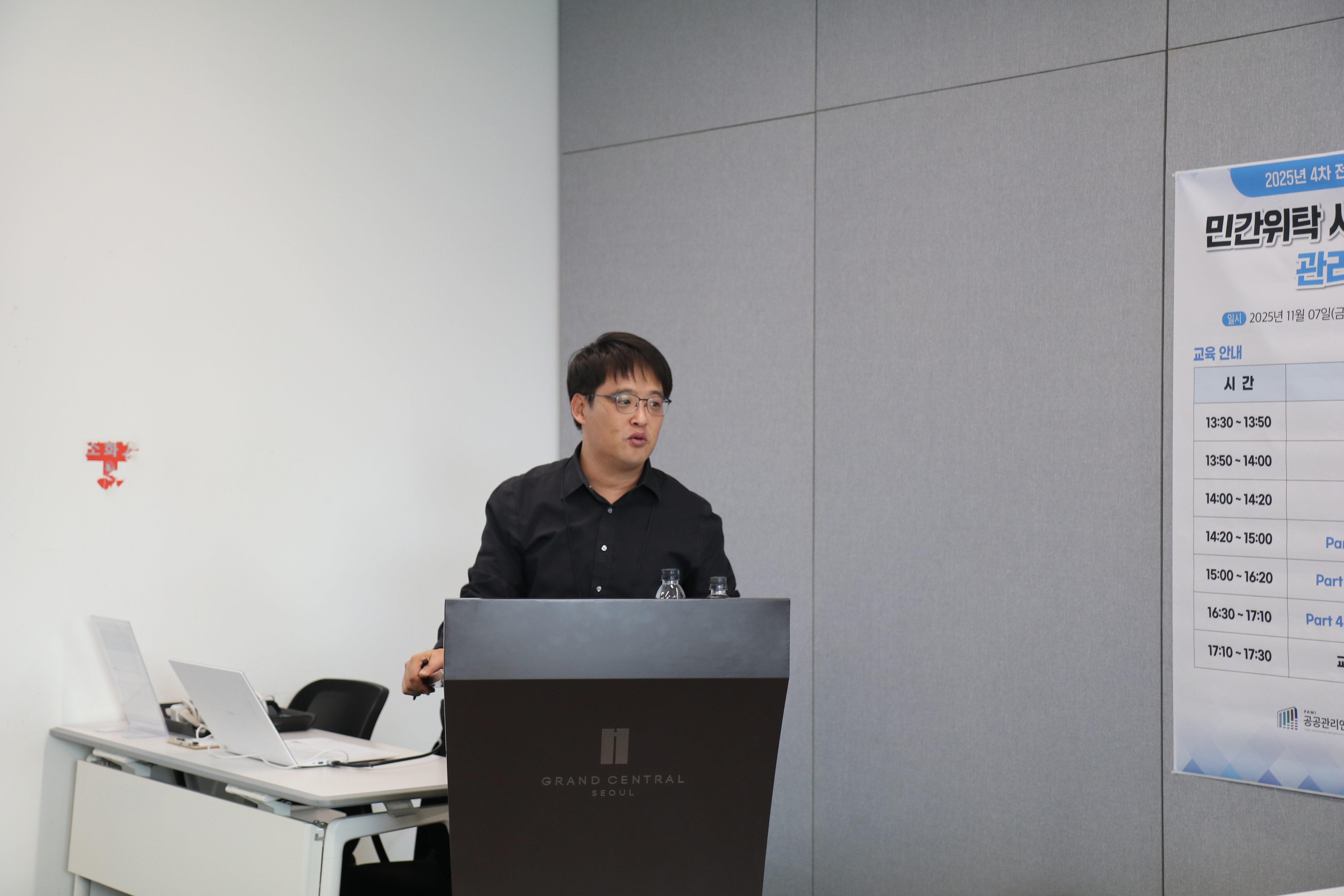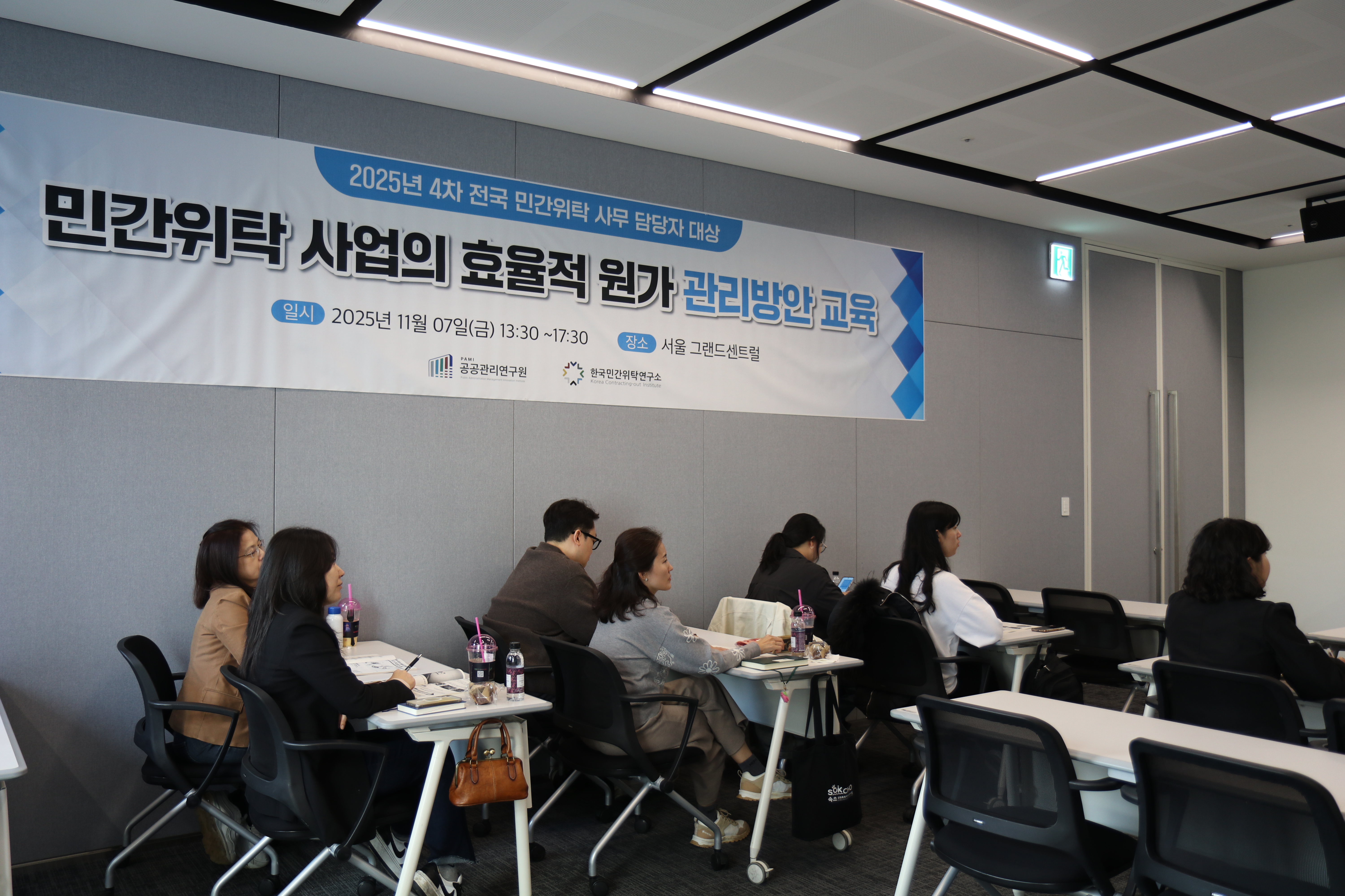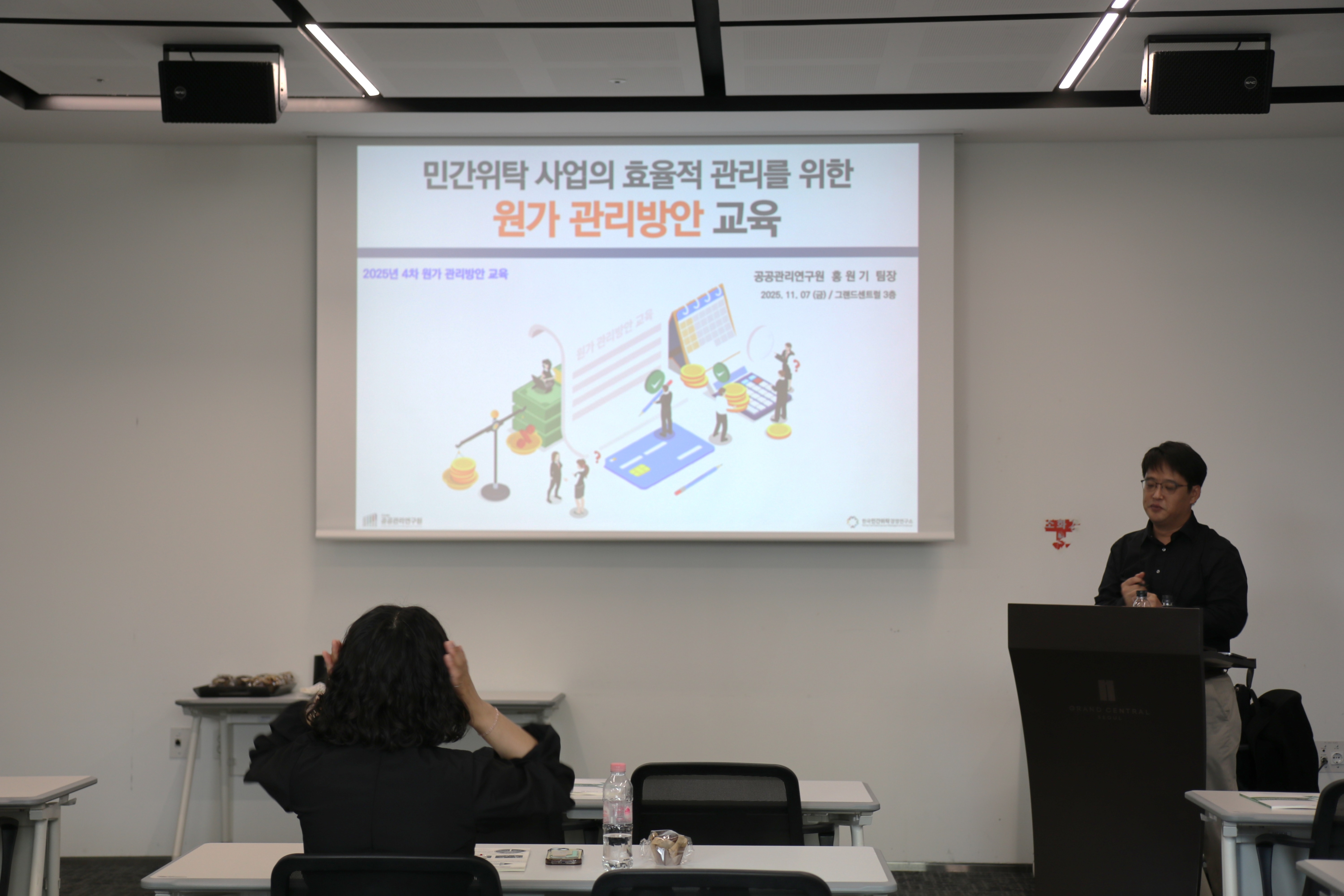 공공관리연구원은 지난 11월 7일, 그랜드센트럴 3층에서 전국 지자체 및 공공기관 담당자를 대상으로 ‘2025-4차 민간위탁 사업의 효율적 관리를 위한 원가 관리방안 교육’을 진행했다. 이번 교육은 민간위탁 제도의 구조적 이해와 함께, 실무 중심의 원가관리와 성과평가 역량을 강화하기 위해 마련되었으며, 공공관리연구원 홍원기 연구팀장이 강의를 맡았다.