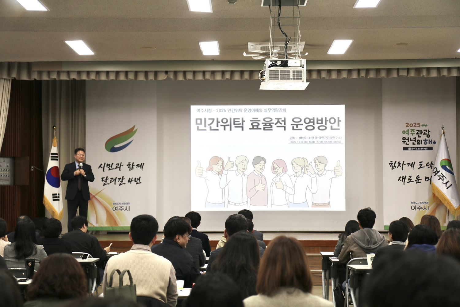 공공관리연구원은 지난 11월 13일, 여주시청 대회의실에서 여주시 민간위탁 사무 담당 공무원 및 민간위탁 사무를 수행 중인 수탁기관 실무 담당자들을 대상으로 ‘민간위탁 운영의 이해와 실무역량 강화 교육’을 진행했다. 이번 교육은 여주시가 추진 중인 다양한 민간위탁 사무의 효율적 운영과 투명한 관리체계 구축을 지원하기 위해 마련되었으며, 공공관리연구원 배성기 원장이 강의를 맡았다.