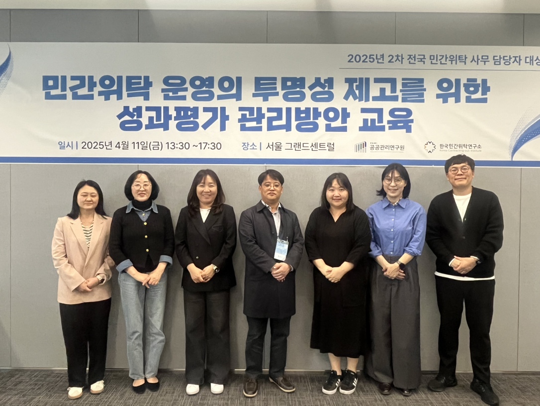지난 4월 11일, 공공관리연구원은 서울역 인근의 그랜드센트럴에서 민간위탁 담당 공무원 및 관련 종사자를 대상으로 2025-2차 민간위탁 운영의 투명성 제고를 위한 성과평가 관리방안 교육을 진행하였다. 본 교육은 교육 진행 전 설문을 통하여 교육생들의 관심사항과 의견을 바탕으로 진행되었으며, 최근 민간위탁 주요 이슈 및 흐름 등을 고려하여 교육 내용이 구성되었다. 해당 교육은 민간위탁의 이해, 민간위탁 효율적 관리, 민간위탁 성과평가 방안, 민간위탁의 투명한 관리의 네 파트로 나누어 진행되었다.
